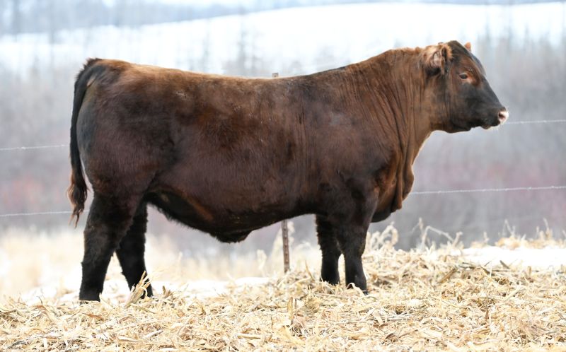 Red Angus, bold & red standout with strong data across the board. Top 6% Pro-S & Top 3% Gridmaster. Powerful, wide, and eye-appealing. Calving ease with growth carcass.